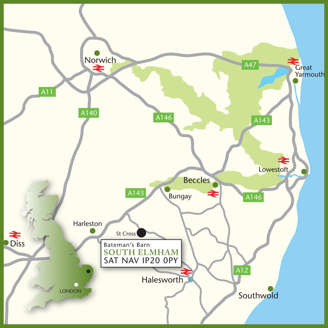 By rail: The nearest mainline rail station is Diss – 90 mins travel time direct from London Liverpool Street
